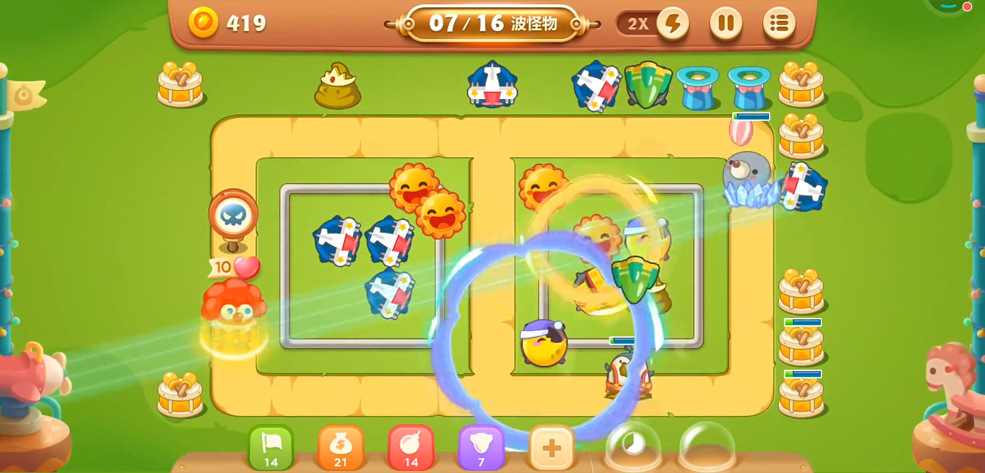 清理障碍物的顺序需要特别注意,初期应避免直接攻击保险箱,而是优先清除四周的障碍物。月亮炮塔的摆放位置至关重要,建议按照攻略图示的位置放置四个月亮炮塔,形成有效的减速区域。玩具飞机作为主要输出炮塔,在清理障碍物阶段可以发挥直线攻击的优势,同时兼顾对怪物的伤害。