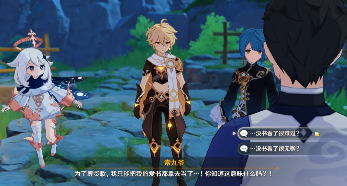 传送到轻策庄碧水源的传送点,沿后方梯子向上攀登至后山,右侧小屋即为常九爷所在地。与他对话时,他会抱怨因生意困境被迫典当藏书,情绪激动。玩家需选择恰当对话选项推进剧情,随后行秋出现并借走书籍。任务要求追踪行秋,需返回轻策庄传送点,向北过木桥至对面房屋前找到他。
