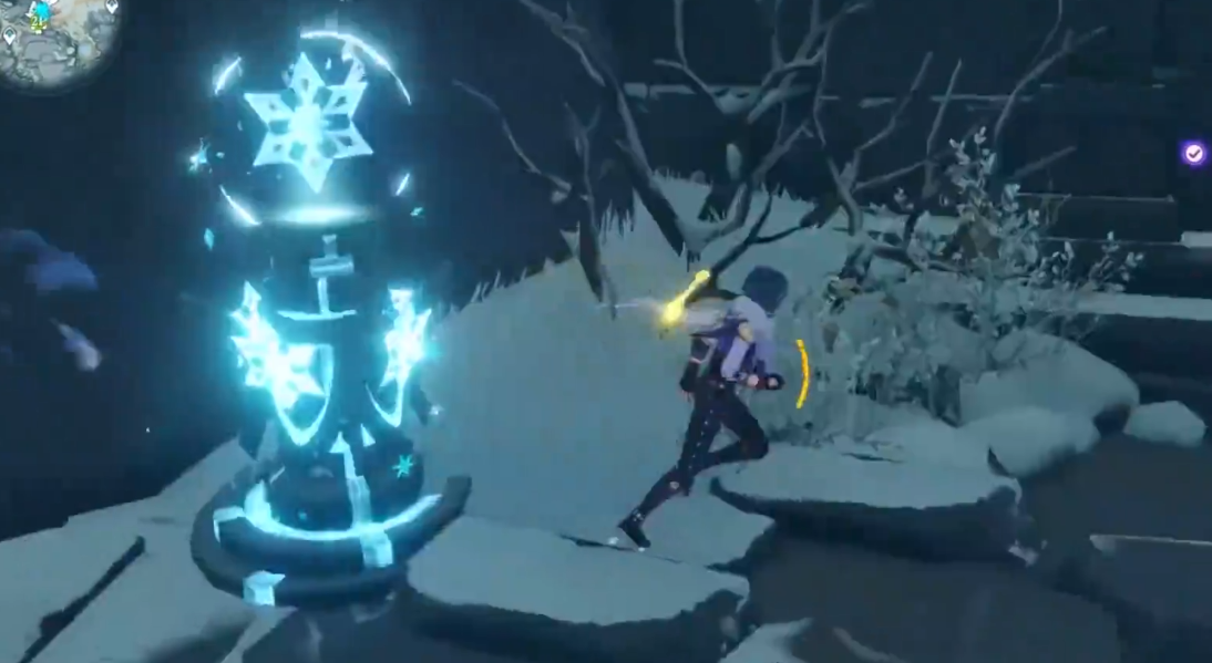 雪山区域的仙灵机关通常需要观察环境线索来破解。冰层下的遗迹重机区域有三个仙灵,需按特定顺序互动:先激活最靠近遗迹重机的仙灵,待其飞到中间位置时激活第二个,当第一个仙灵飞到两柱之间时再激活第三个。