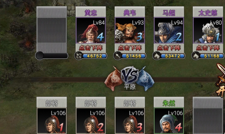 进入战斗后,武将出场顺序应为典韦、马超、太史慈、黄忠。典韦首发出战需立刻释放战法混乱对手,利用白虎套装快速击杀前三排,剩余残兵承受敌方战法后由马超接手。马超上场后优先平砍而非释放战法,保留兵力应对后续敌方武将的战法攻击。太史慈在第三位出场时需确保战术克制,通过驱虎套装的平砍和双战法削弱敌方兵力。黄忠作为压轴武将,开场直接释放战法对朱然造成致命打击,剩余兵力通过战术克制完成收割。若过程中出现战法被抵挡或战术克制失败的情况,需重新调整策略。