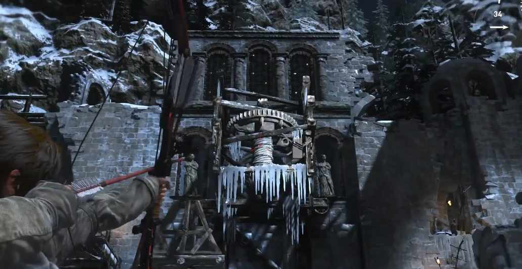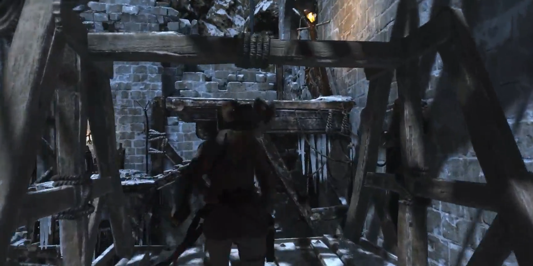 首先利用中间的绞盘将两个平台调整至左低右高的状态,平台可以通过旁边的柱子固定位置。完成调整后,迅速跳至右侧高台,并将右侧高台的绞盘与对面的机关连接。这一步骤的关键在于确保平台位置稳定,避免因失衡导致后续操作失败。
