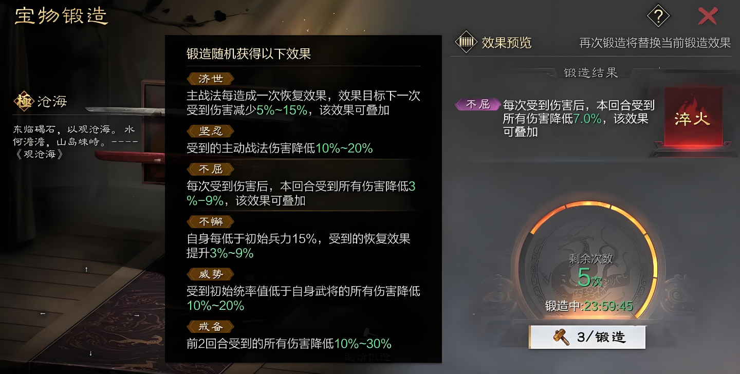宝物系统是率土之滨中提升武将战力的重要途径,其升级流程包括打造、强化、进阶和锻造四个核心环节。打造是获取宝物的基础方式,玩家需通过陈情界面的工匠事件委托打造,每日8点随机刷新工匠,持续24小时。打造需消耗铜钱并等待24小时,也可花费100虎符立即完成,但性价比不高。精品和次品是主要产出,次品无法强化且赛季结束清零,精品则可进一步培养。