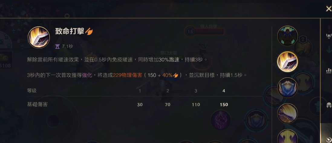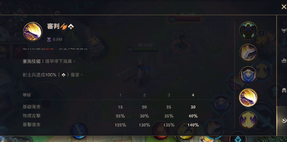 盖伦作为英雄联盟手游中的经典战士英雄,其技能组合以简单高效著称。被动技能坚韧使他在脱离战斗后持续回复生命值,这是对线期赖线的核心保障。Q技能致命打击提供移速加成并移除减速效果,强化普攻附带沉默,是起手接近或打断敌方技能的关键。W技能勇气分为被动护甲魔抗叠加和主动减伤护盾,需精准把握开启时机以抵挡爆发伤害。E技能审判作为主要输出手段,持续旋转造成范围物理伤害,外圈命中可触发暴击效果。R技能德玛西亚正义则是斩杀型大招,对低血量目标造成真实伤害,需注意敌方血线估算斩杀阈值。