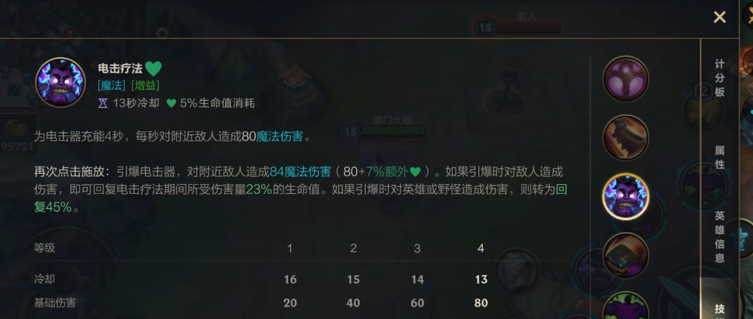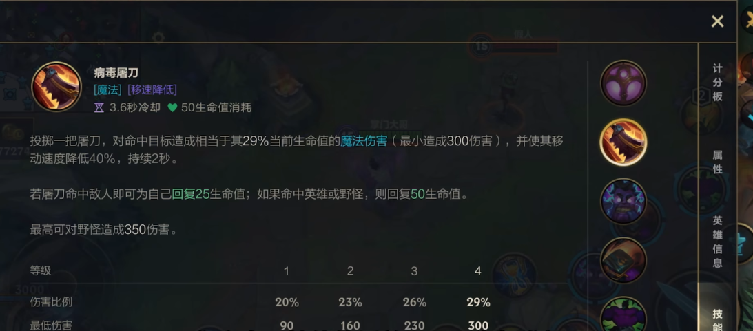 核心输出技能是E技能潜能激发,血量越低攻击力加成越高,残血时一个头槌能打出成吨伤害。Q技能病毒屠刀不仅是远程消耗手段,命中后还能回血,对线期多用它骚扰对手。W技能开启后持续灼烧周围敌人,清线和打团时记得保持开启状态,虽然会消耗生命值但收益很高。大招是暴力玩法的精髓,瞬间回复大量生命值的同时提升移速和攻击力,残血开大反杀是基本操作。