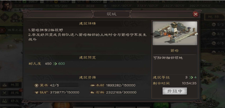 箭塔应该优先建造在主城四周的关键位置,特别是靠近资源点的方向。中期资源充足时,建议把箭塔升到五级,这样守军兵力会大幅提升。升级箭塔需要消耗策书、木材、铁矿和石料等资源,记得提前储备。箭塔的真正价值不在于完全阻挡敌人,而是制造麻烦让敌人计算得失后放弃进攻,同时削弱敌军为主力创造收割机会。