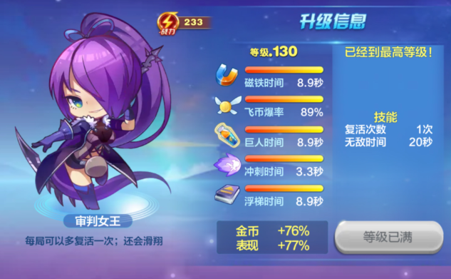 除了吸血伯爵,审判女王也是个不错的选择。虽然她的冲刺时间稍微短一点,但有了死神镰刀和审判契约这些专属宝物后,长跑能力也是杠杠的。她还有个特别实用的功能,就是能多钻石复活一次,这对于练习技术和跑更远距离特别有帮助。要是你喜欢稳扎稳打的跑法,审判女王会是个很好的伙伴。