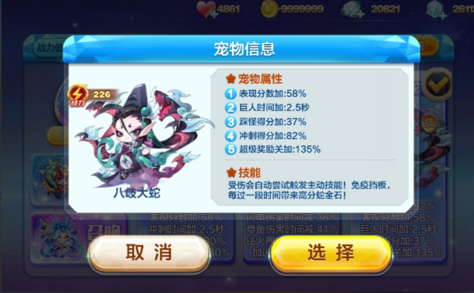 宠物和精灵的选择也很重要,它们能给你的长跑带来额外加成。选那些能增加表现分或者保命能力的宠物,比如能自动触发技能的八岐大蛇,受到伤害时就会放技能,这样就算不小心撞到障碍物也不怕。精灵方面优先选加分能力强的,这样跑起来分数涨得飞快,轻轻松松就能爆分。