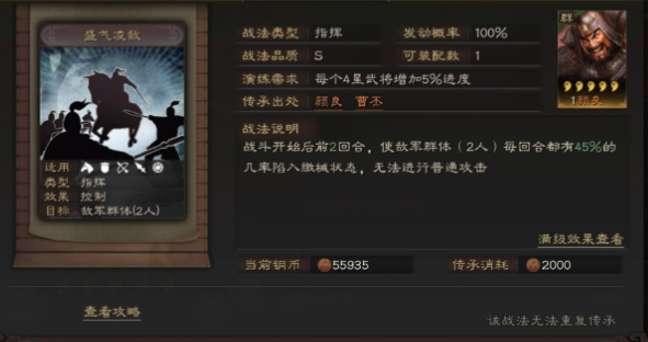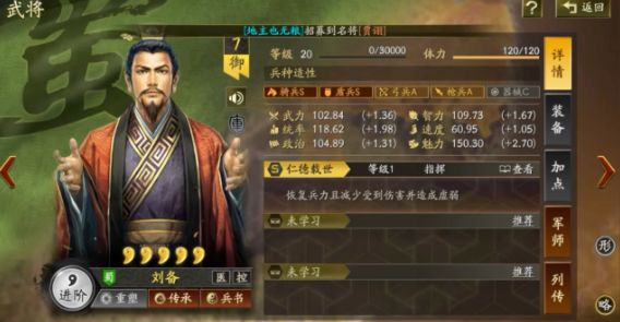 刘备的核心战法仁德载世具有每回合治疗两名友军并概率虚弱敌方的效果,主将位置可提升虚弱概率至25%。开荒阶段建议搭配孙坚、张飞等武将组成双刷阵容,刘备携带御敌屏障、陷阵营等战法可显著降低战损。2000兵力左右即可尝试四级地,但需注意战损控制,后期转型时可考虑桃园盾或蜀枪等主流阵容。
