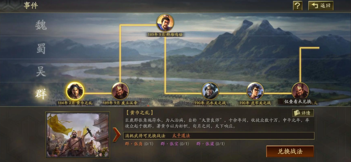 事件战法是S2赛季新增的核心玩法,需要通过消耗特定武将解锁历史事件获取强力战法。太平道法需张角、张梁、张宝组合,气凌三军需华雄和潘凤,这些战法对阵容强度提升明显。开赛前应锁定相关紫卡武将避免误分解,每个事件战法激活后还需消耗额外武将完成剩余70%演练进度。兵书系统在攻破四级城后解锁,橙将开启兵书需10张紫卡和9万铜币,提前准备紫卡资源十分必要。