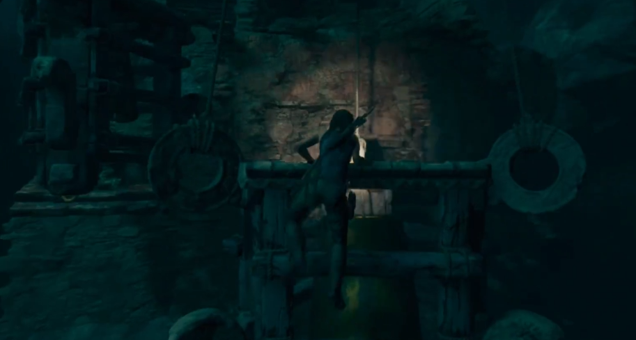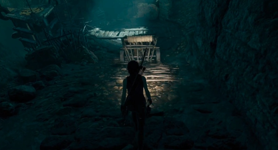 在走廊尽头用绳索箭矢搭起滑索,滑到对面后,利用吊钟跳攀左侧高台的岩壁。如果吊钟降到最低,可能需要抛钩斧才能挂住。爬上去后,将右前方坡上的推车推下来,然后到左侧转盘处。按互动键旋转转盘,让推车有绳索的一端朝向自己,再用绳索箭矢连接推车和转盘。