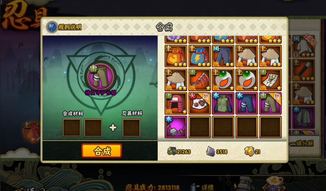 合成时要注意选择忍具类型,用普通散装忍具合成可能随机出散装或套装,但概率较低;而直接用套装忍具合成更容易出同系列究忍具。比如痛楚套装合成大概率出痛楚究,但偶尔也会歪到其他套装。如果想稳一点,最好攒够多余的究忍具再合成,这样必出究品质,虽然材料消耗会翻倍但成功率百分百。