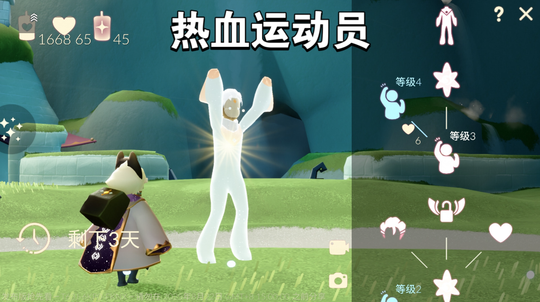 另一条白色连体裤的获取方法稍微复杂点。咱们得先到云野的隐藏图,穿过右边云顶浮石区域,找到三层瀑布左边的喷气泉。热血运动员先祖就在那里,解锁他的动作后就能看到兑换树。白色连体裤需要70根季节蜡烛,比工装裤贵不少,但款式很特别,搭配矮人发型会显得特别可爱。