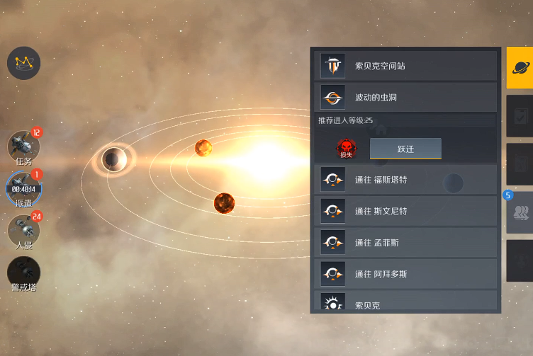 虫洞分为五个等级:平静、波动、异常、凶险和危险,难度越高奖励越丰厚。进入虫洞前需通过星图筛选虫洞分布,不同颜色标记对应不同等级。舰船在虫洞中会持续损失能量,最高可达95%,因此必须配备增加能量的组件,确保战斗续航能力。优先选择W3型虫洞,其掉落优质装备概率最高,但需按W1→W2→W3顺序进入,同时做好应对高强度敌人的准备。