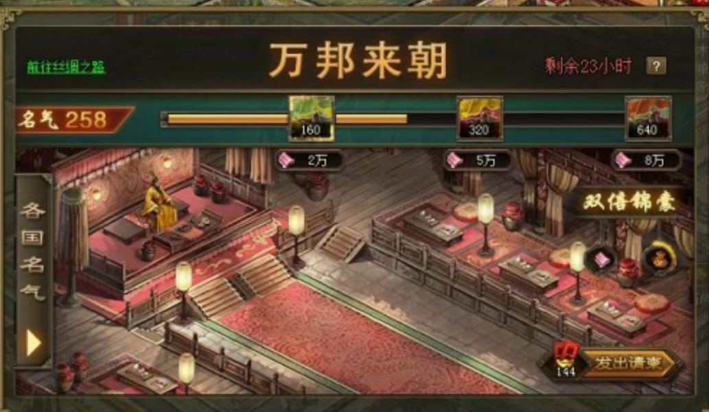 攻城掠地万邦来朝活动是获取珍宝碎片的重要途径,咱们可以通过发起请柬让不同国家进贡,从而拿到丝绸、锦囊和招商令奖励。每天系统会送10张免费请柬,连续三天参与就能积累名气值,达到200点还能解锁畅行四海buff。建议先把免费请柬用完再考虑花金币补足,这样性价比最高。名气提升后不仅能拿到称号,每次进贡的丝绸数量也会随着已有珍宝数量增加,所以前期多攒资源很关键。