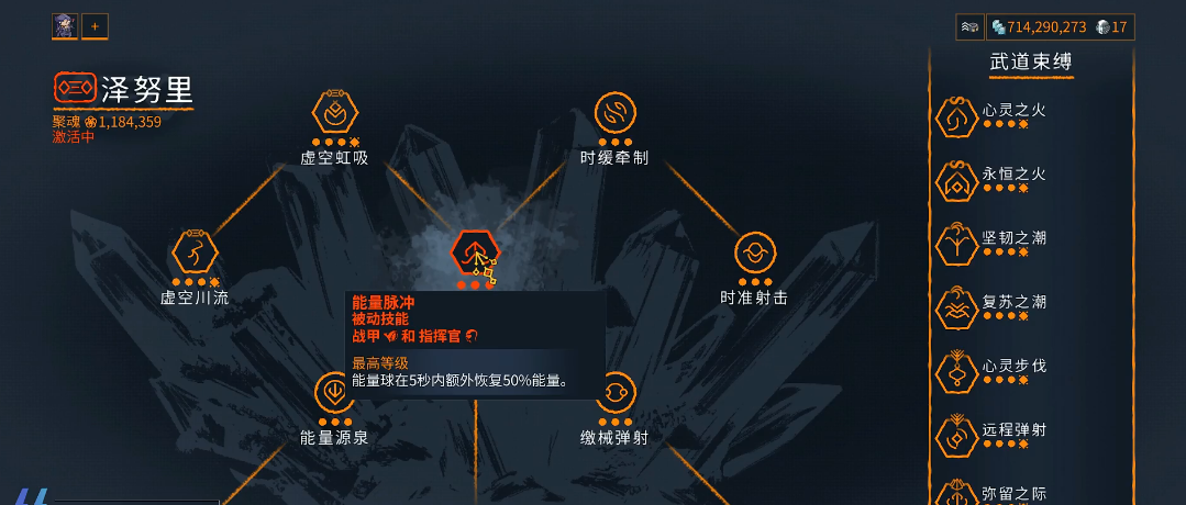 泽努里的核心技能能量源泉是回蓝的关键手段。该技能需在学派中优先解锁,释放后生成持续30秒的能量区域,为范围内友军提供能量恢复与技能强度增益。战斗中需注意技能覆盖范围与时机,配合虚空川渡被动提升指挥官能量上限,可进一步优化续航能力。
