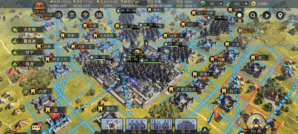 拆城防值这个阶段其实挺关键的,别以为打完守军就轻松了。每次你去攻击要塞拆耐久,它还会刷出大约六百兵力的临时守卫来干扰你。所以你派的拆迁队,兵力不能太少,至少得有个一千以上,不然容易被这些守卫给打回来,耽误时间。拆迁队要选那些攻城值高的武将,比如木鹿大王、于禁这类,他们拆起来效率高。如果条件允许,你甚至可以在要塞旁边自己建一个驻军要塞,把攻城队提前放进去,这样能大大节省来回行军的时间,确保在半小时内完成拆除工作。