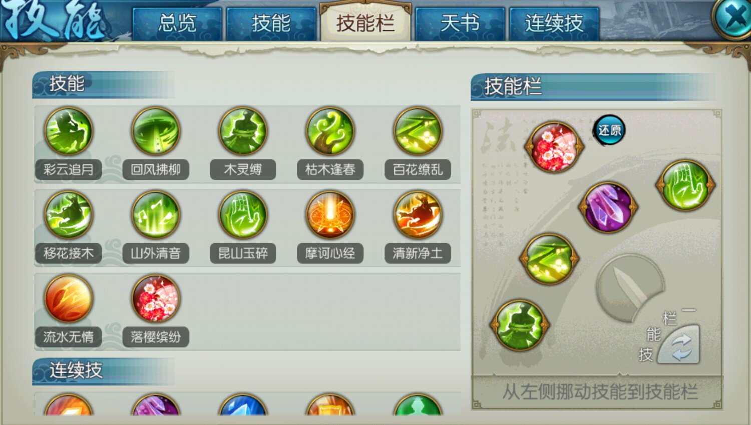 除了流派差异,一些通用性原则也需要注意。比如彩云追月作为关键的位移技能,无论哪种流派都应保留,它进退自功能性无可替代。回风拂柳在释放期间拥有无敌帧,是规避致命伤害的神技,也值得一个栏位。被动技能如增加暴击的奇韵、提升气血的矫健等虽然不占用快捷栏,但一定要通过技能点加满来强化基础属性。游戏内的连续技系统是解决技能栏紧张的好帮手,你可以把木灵缚和百花缭乱这样的控制接爆发组合绑定在一起,按一次键就能完成一套小连招,极大地节省了操作空间和反应时间。