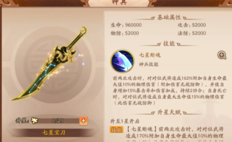 针对司马懿的输出需求,七星宝刀是首选的攻击型神兵,它能大幅度提高暴击概率和谋略属性,让司马懿的技能触发更频繁,从而在较短时间内压制对手。七星宝刀的词条还能在神兵升星时优先激活暴击相关属性,确保司马懿在中后期战斗中能保持稳定的爆发伤害,这件神兵的触发机制与司马懿的合击技计破乾坤高度契合,能弥补他基础攻击力的不足。