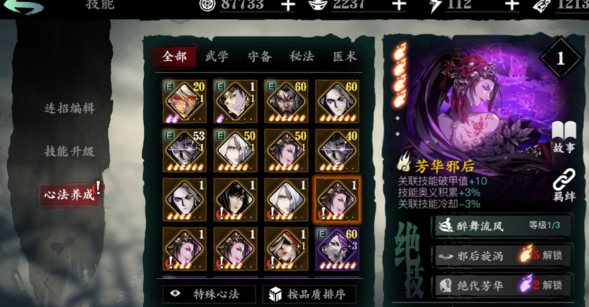 具体到心法选择上,有一些公认比较强力的组合你可以参考。其中一个核心思路是围绕暗夜飘香这张专属心法来构建。这张心法的好处很多,它能稳定提供杀意点,关键是它的核心效果虚空结界开启后能短时间内大幅提升攻防属性,并且在结界内还能快速恢复护甲,这对于避免被敌人破甲导致陷入被动非常有用。为了发挥它的最大效果,常常会搭配芳华邪后组成万千幻术羁绊,这个羁绊能显著减少长技能链的冷却时间,让你的技能释放更连贯。如果你追求极致的爆发伤害,那么魔堡故人、黑白剑(黑暗无情与白衣留情组合)这类增伤心法也是常见的选择,特别是黑白剑羁绊能提供巨额的伤害增幅,当然代价是自己也会变得更脆,需要更好的操作来规避伤害。