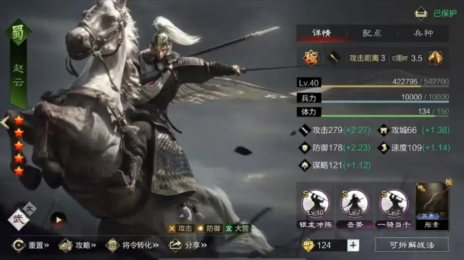 赵云的优势在于他全面的属性成长,攻击和防御都不错,这让他能很好地适应前锋的位置。他的银龙冲阵战法不需要准备回合,发动概率高,能迅速瞄准敌人单体造成大量伤害并附加增伤效果。这样一来,赵云不仅能充当肉盾,还能在关键时刻爆发出可观的伤害,适合那些需要前锋也参与输出的队伍。