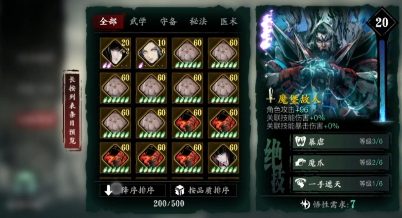 心法选择首先要考虑品质与悟性限制。心法分为橙色、紫色、蓝色和白色等品质,高品质心法效果更强但消耗的悟性值也更多,一个60级角色的总悟性值为64点,这意味着无法全部装备高品质心法,必须进行取舍和搭配。一套成型的配装会采用橙色与紫色心法混搭的方案,以激活关键羁绊效果为核心。初期可以先用一些提供全面属性的紫色心法过渡,例如芳华邪后和暗夜飘香,它们能提供稳定的属性加成和技能辅助效果,是性价比很高的选择。