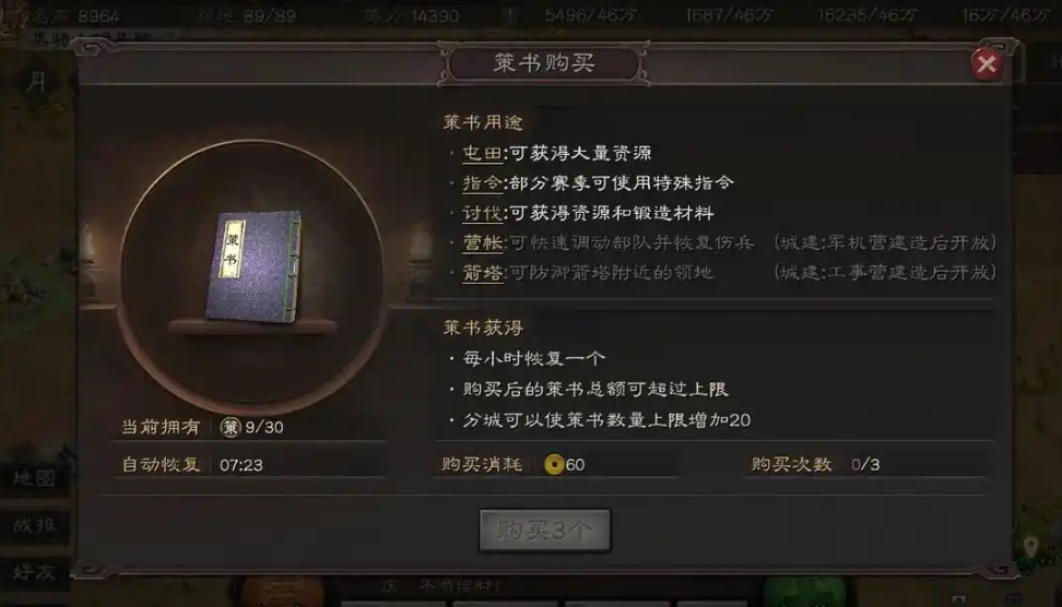 资源管理方面,占领4级地后应及时放弃空地和低级地,优化领地布局以聚焦高级资源产出。侦查守军信息是减少不必要兵损的有效方法,派遣少量兵力试探可以获取守军兵种详情,从而调整阵容进行针对性克制。确保粮草和预备兵储备充足,避免补给中断影响开荒节奏,合理使用策书进行屯田或侦查能加速资源积累。