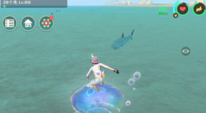 开始捕捉幼鲭鲨时,要先找到它的踪迹,然后用剑攻击将它的血量压制到大约三分之一,接着切换成木棒连续敲打直到眩晕。注意躲避幼鲭鲨的螺旋冲刺攻击,可以携带冰霜渔网来减速它。等它晕倒后,立即投喂饲料,直到头上出现爱心标识,这时使用坐骑鞍就能完成捕获了。