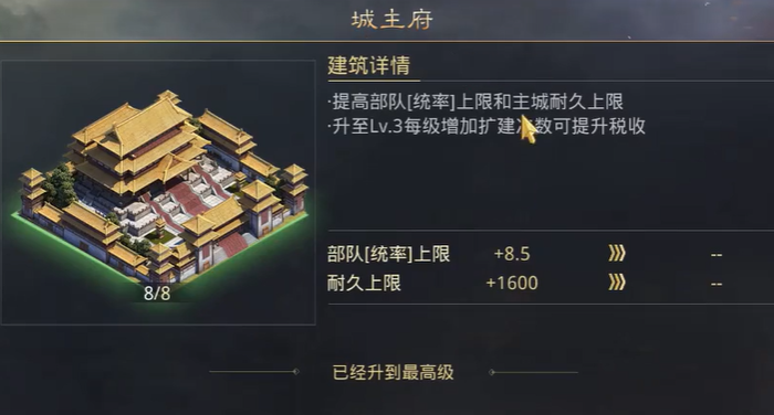 军营是你军事力量的核心建筑,它的核心作用是直接增加单个武将的带兵上限,每提升一级就能为你的每位武将增加200的兵力,这对部队整体战斗力的提升是立竿见影的。如果你想开始建造并升级兵营,首先需要满足一个硬性前提,那就是将你的城主府提升到7级。你的前期发展路线需要围绕这个目标来规划,优先完成主线任务,为主城升级铺平道路。