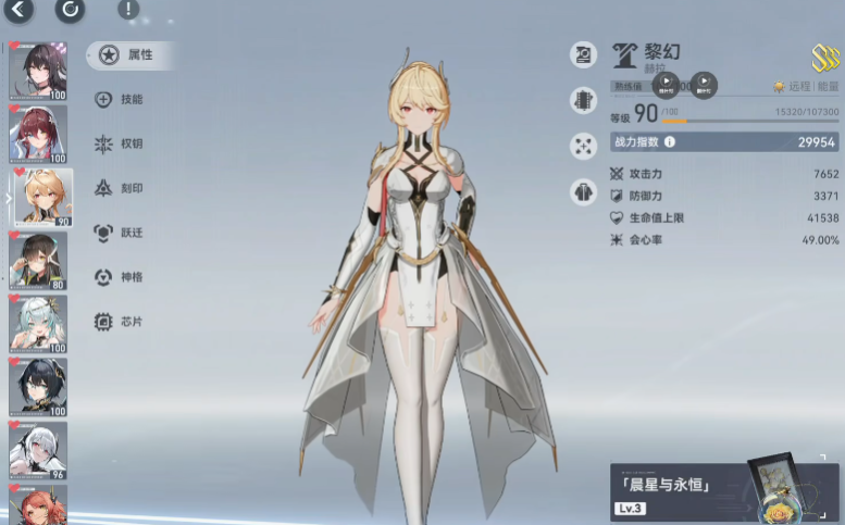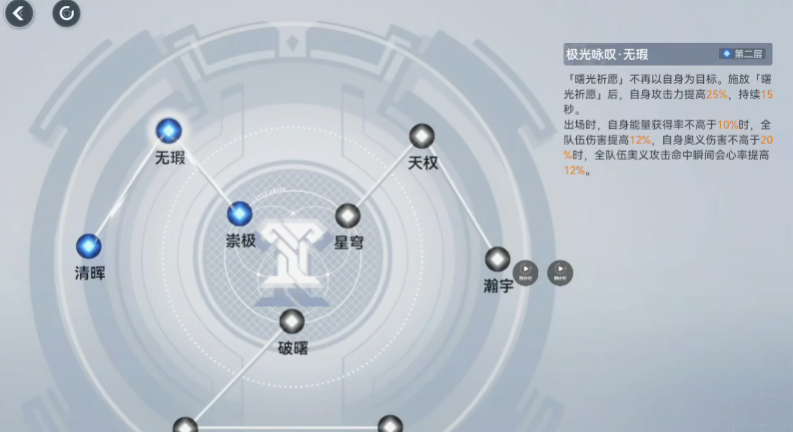 赫拉则以光属性技能为核心,她的普通攻击发射流光造成伤害,技能一陨落晨星召唤流星打击范围内的敌人,技能二曙光祈愿在造成伤害的同时提升友方攻击力,技能三黄道天枢增强全队伤害并返还机制值,奥义永昼回响进一步强化团队输出和生存,闪避技能还能触发零时空间减速敌人。赫拉的辅助能力极为突出,能提供稳定的增伤效果,同时自身技能倍率不低,让她在输出方面也有一席之地,适合多种队伍配置。