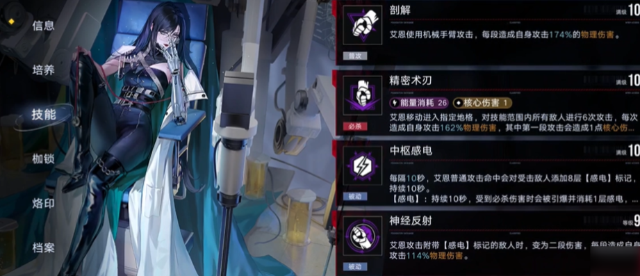 艾恩是一位集破核与辅助能力于一身的诡秘系禁闭者,她并非开荒期的首选,但对技能、枷锁和装备有一定要求,在特定阵容和环境下能发挥强大的作用。她的核心优势在于拥有可造成核心伤害的必杀技能精密术刃,以及能为团队提供增益的感电标记机制,是一位需要深入理解其技能联动性才能驾驭的功能型角色。