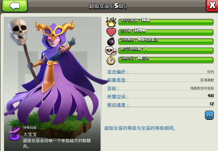 女巫是一个重要远程单位,其核心能力在于持续召唤小骷髅进行作战,这一特性使她在多种战术阵型中扮演关键角色。女巫的基础技能是每秒生成一个小骷髅,持续40秒,这些小骷髅虽然移动速度较慢,但攻击力适中,能够有效吸引火力并提供持续输出。当女巫升级到二级时,还会获得火球术这一范围伤害技能,进一步增强了她的清场能力。在实战中,女巫的生命值相对较低,因此需要合理的阵型布局和保护措施来最大化其作用,无论是进攻还是防守,理解女巫的属性和技能是有效运用的基础。