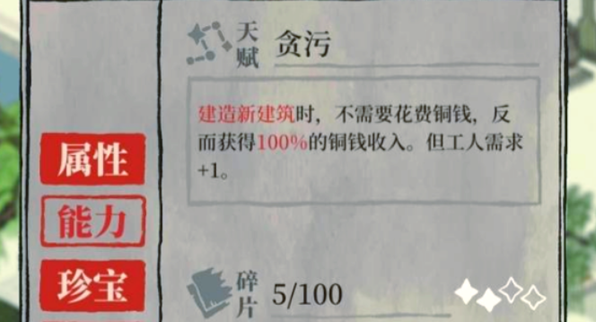 魏忠贤的核心厉害之处在于其天赋贪污。该天赋的效果是,当他负责建造全新的建筑时,不仅不需要花费金钱,反而能获得相当于建筑造价100%的铜钱作为回扣,这相当于凭空赚取了一笔建造费用。这个强大的效果伴一个代价,就是建造时需要额外多消耗1个工人。这个技能设计非常有意思,它直接将建筑成本转化为收入,在游戏金钱消耗巨大的中后期,如开辟新区域、升级进阶法宝时,能有效缓解经济压力,是一个既能赚钱又能解决部分资源问题的神技。