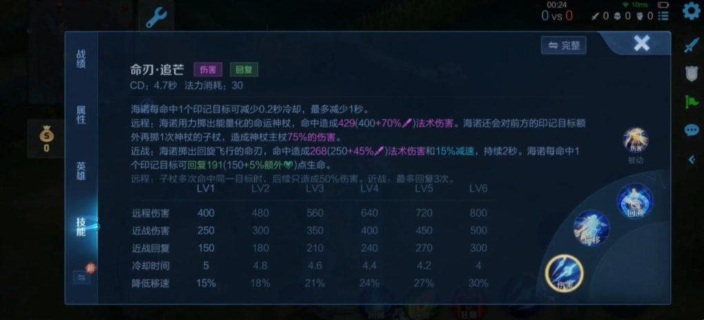 海诺的技能设计是其战术灵活性的基础,一技能是主要输出手段,远程形态下投掷长矛用于消耗和清兵,命中带印记的敌人会触发额外分裂伤害。近战形态下则变为投掷回旋飞刃,造成伤害并减速目标,同时可回复自身生命。二技能是形态转换的关键,使用后根据落地处是否有敌人自动切换为近战或远程状态。大招命运回溯则提供了极高的操作上限,它能在原地留下印记,短暂延迟后将海诺的状态回溯到4秒之前,包括生命值与法力值,此技能可用于极限逃生、反打或分割战场,甚至在特定条件下配合队友刷新后能实现战术配合。