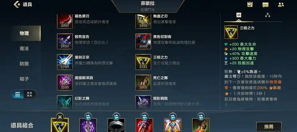 剑姬的出装核心在于平衡输出、生存和机动性。三相之力是绝对的首选,它能全面提升攻击力、攻速和技能急速,完美契合剑姬的Q技能特效。贪欲九头蛇则是另一件关键装备,提供清线能力和吸血效果,让对线和团战更流畅。如果对手控制较多,水银鞋和死亡之舞能大幅提升容错率,而复活甲则是后期团战的保命神器。