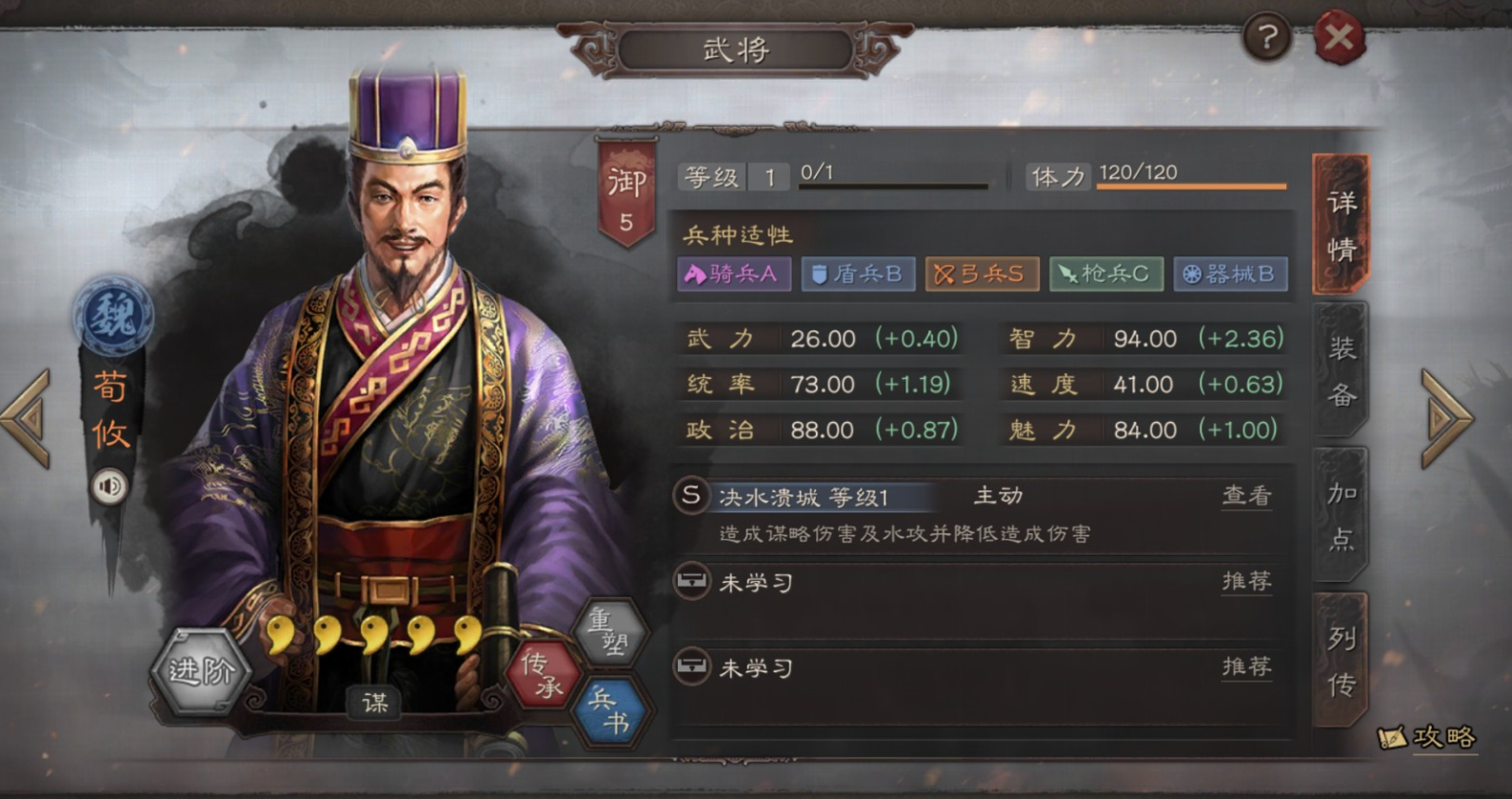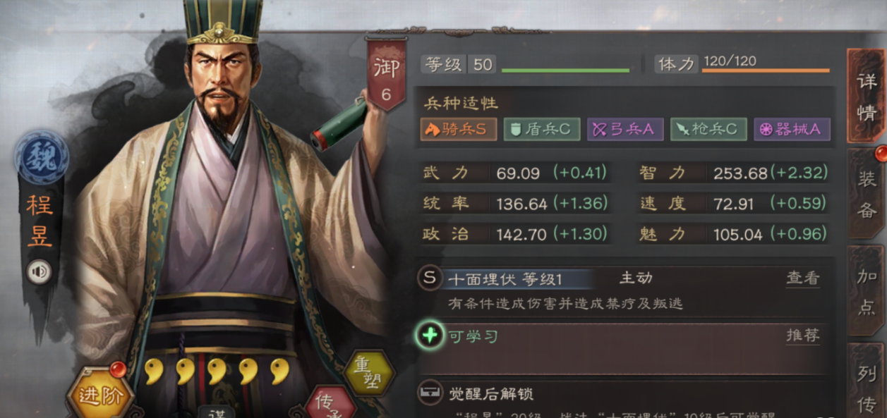 开局需优先侦查避开盛气凌敌队伍,战斗中贾诩的混乱可能误伤队友,需通过刮骨疗毒或草船借箭及时净化。程昱的十面埋伏需配合负面状态触发,因此贾诩的伪书相间或熯天炽地可作为备选。兵书选择上,贾诩以虚掩+速战为主,程昱必带以治击乱+鬼谋,荀攸可选援其必攻+励军。