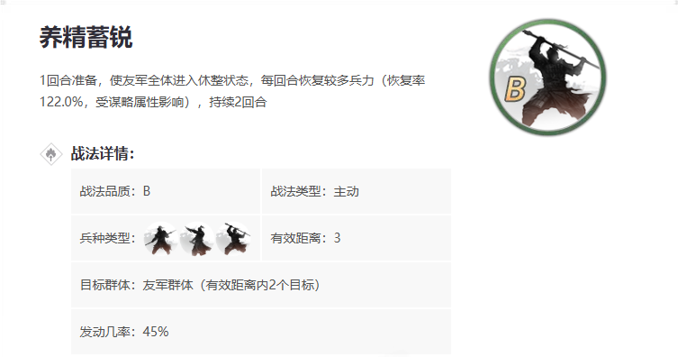 养精蓄锐的核心价值在于高额累计治疗量。其延迟生效的机制虽可能错失最佳治疗时机,但配合指挥类战法的优先级特性,能在后续回合中持续提供稳定恢复。该战法通常配置于大营武将,通过与其他延迟生效技能(如指挥伤害或控制)形成联动,构建后期发力的战术体系。需由于无法治疗携带者,队伍需额外保障其生存能力。