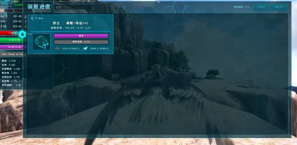 驯服狮鹫需要准备麻醉箭或麻醉镖、生肉以及狮鹫鞍具。狮鹫通常栖息在高海拔区域,如高山或悬崖峭壁,建议优先在地图中的Ragnarok或Scorched Earth等DLC地图的狮鹫峡谷或远峰山脉寻找。由于狮鹫是飞行生物且无法被流星锤束缚,必须建造困龙房或利用地形将其引入封闭空间,再用远程武器击晕。麻醉箭需求量较大,建议准备100支以上以应对高等级狮鹫的眩晕值消耗。