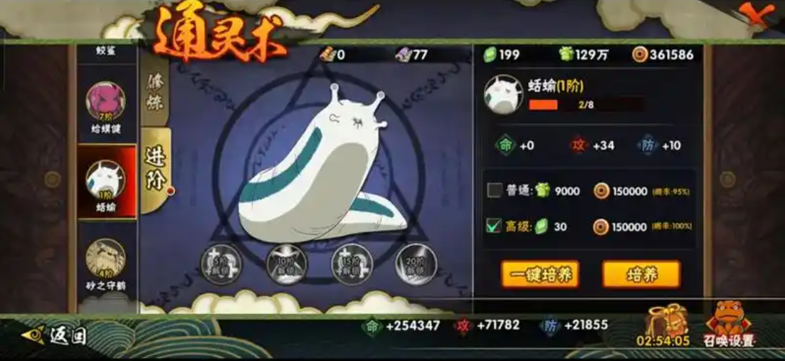 选择合适的通灵兽也很重要,不同通灵兽有不同定位。比如忍犬适合快速突进,蛞蝓擅长治疗,蛤蟆吉偏向控制,而乌鸦则是平民玩家的优质选择,觉醒后能提供高概率目盲效果。橙色通灵兽虽然战力加成高,但培养成本较大,紫色和蓝色通灵兽的觉醒技能在实战中往往有奇效。如果追求战力提升,可以优先培养橙色通灵兽;如果更看重战术搭配,紫色通灵兽的觉醒技能值得投入。