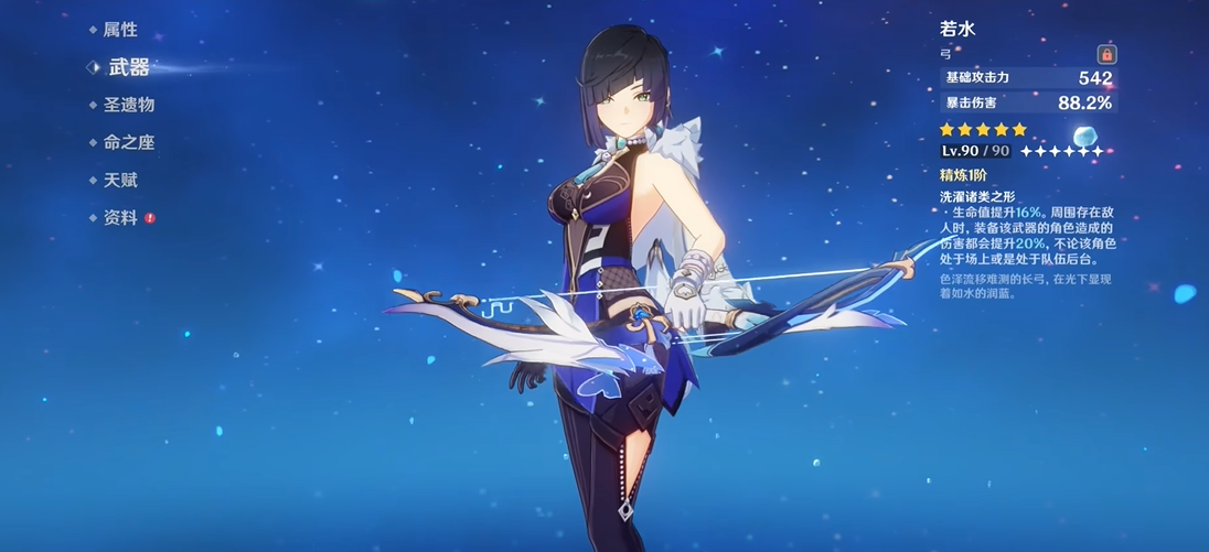若水这把五星弓最大的优势就是暴击伤害加成特别高,在所有弓类武器里数一数二,而且特效还能无条件提升伤害,周围有敌人就能触发,不管角色是在场上还是后台都能吃到加成。生命值提升的副属性虽然对大多数弓箭角色用处不大,但聊胜于无,至少能增加点生存能力。