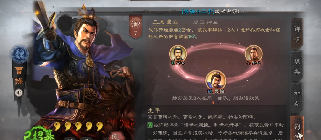 阵容方面,徐晃的常见搭档是曹操和典韦,曹操提供增伤和减伤,典韦负责援护和反击,三人组合能形成攻守兼备的体系。如果没有曹操,也可以用郭淮或曹仁替代,虽然强度稍逊,但依然能玩。兵书推荐选攻其不备和将威,进一步强化输出能力。加点方面全武力就行,毕竟咱们的目标就是让徐晃打出爆炸伤害。