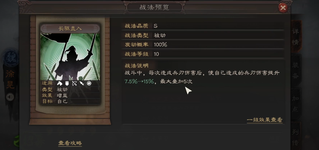 徐晃的自带战法长驱直入是核心优势,每次造成兵刃伤害后能叠加增伤效果,最高可提升75%兵刃伤害。这种机制决定了他适合搭配多段伤害型战法,比如轻勇飞燕、骑虎难下等,能快速叠满被动。如果咱们手里有曹操或典韦,可以优先考虑组魏盾队,徐晃主C的爆发能力会让对手非常头疼。战法选择上尽量以群攻和多次攻击为主,这样才能最大化他的输出潜力。