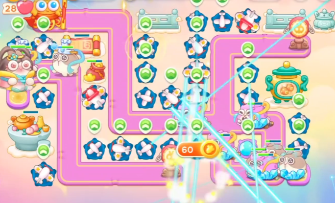 中期阶段重点升级右侧的船锚炮塔到满级,同时补充几个风扇炮塔来应对飞行单位。这时候怪物会分多路进攻,咱们得观察好每条路径的火力覆盖情况。左侧区域可以适当放两个减速泡泡塔,给主力输出争取时间。金币要优先用在关键位置的满级升级上,别急着铺太多低级炮塔。