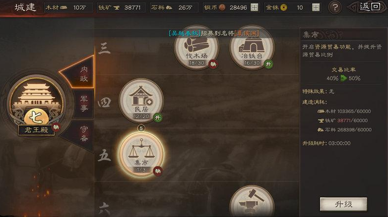 城建系统对战力提升同样至关重要,合理升级建筑能带来全方位加成。军营升级可增加带兵上限,兵站系列建筑能提升武力、谋略、统率和速度等基础属性。君王殿等级决定了其他建筑的解锁进度,建议优先升级。铁匠铺、寻访台和驯马场等设施能为武将提供强力装备,这些装备虽然获取难度较高,但对属性提升有明显帮助。建筑升级需要统筹规划资源分配,避免因资源短缺导致发展停滞。