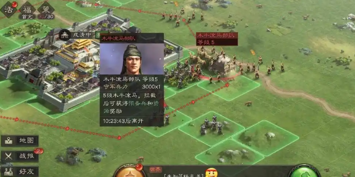 每日刷新的木牛流马需及时拦截,击败后获得随机资源与预备兵。贼寇讨伐则产出装备材料,但需消耗策书,非必要时可优先屯田。蛮族周末刷新,讨伐后主要获取铜币,适合补充征兵消耗。野怪机制要求玩家合理分配体力,避免主力部队过度损耗。