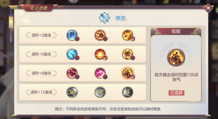 张春华作为高爆发型主C武将,潜能选择需围绕其核心输出机制展开。战意-摧折/刀锋-凯歌-刺袭/叠浪是当前主流搭配方案,其中+3战意潜能可确保先手优势,配合孙尚香等武将快速压低敌方后排血量。进阶+5阶段需根据培养进度选择摧折(5火前)或刀锋(5火后),后者能精准锁定残血目标提升收割效率。+8凯歌潜能则通过三连怒攻实现战场清场,形成完整的输出循环体系。