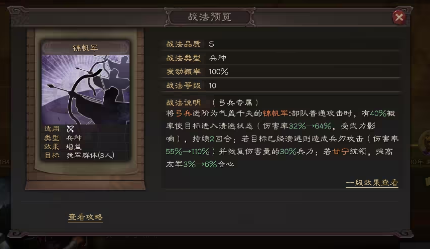 从战术层面分析,溃逃状态适合搭配高武力型武将使用,如徐盛、关羽等。这类武将不仅能通过自身高武力值放大溃逃伤害,还能与其他输出战法形成互补。常见的溃逃类战法包括神上使、刺伤、万箭齐发等,其中神上使作为全体溃逃效果的代表战法,在群体输出方面表现尤为突出。锦帆军兵种也能通过普通攻击概率触发溃逃状态,为战术组合提供更多选择。