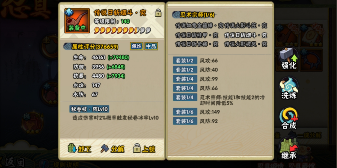 忍具合成是另一种靠谱方式,分解多余的紫色或低级橙色忍具能攒金色精华,攒够材料就能尝试合成。前期建议先用废橙过渡,等凑齐3个金色精华再合成套装橙,比如痛楚套或神速套。千万别急着分解魅影愤怒套装,虽然单件属性一般,但凑齐一套也能用。洗炼符尽量留给好属性的忍具,上品洗炼符能锁住上品属性,比随机洗更划算。