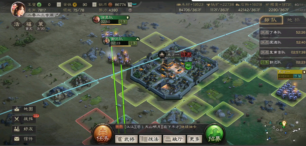 侠客军迁城和行军比正规军更灵活,每24小时可调整一次位置,48小时可迁城一次,仅需消耗少量资源。这种机制让侠客军能快速转移战场,游击作战。建议优先选择靠近码头的区域,侠客军可无视码头限制渡河,但正规军不行,这能有效规避封锁。侠客军征兵速度提升40%,体力上限更高,适合频繁作战,因此落州时要考虑周围是否有足够的目标供掠夺,比如活跃玩家多的区域或资源建筑密集地带。