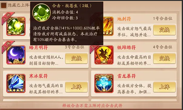 兵符选择直接影响战局走向,一号位兵符推荐截江符,能为前排提供25%-35%闪避概率,大幅提升2号位主坦的生存能力。二号位必选地刺符,其单体高伤害配合稳定减怒效果(三星减少3点怒气),可有效压制敌方关键武将的技能释放。三号位根据阵容选择救苍生、撼天冰封符或狂熊符,蜀国优先考虑救苍生提升团队续航。兵符触发频率与阵容完整性直接相关,需确保2号位坦克能承受敌方2456四个单位的集火。