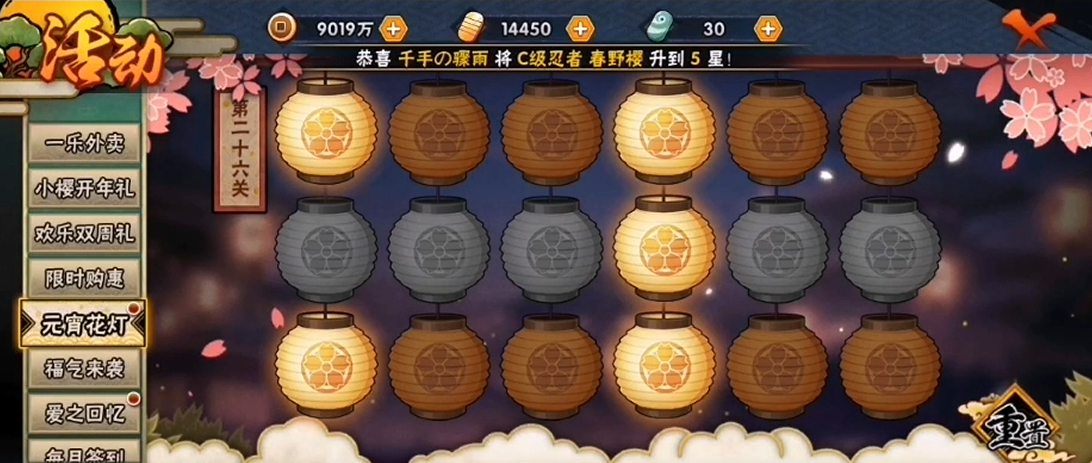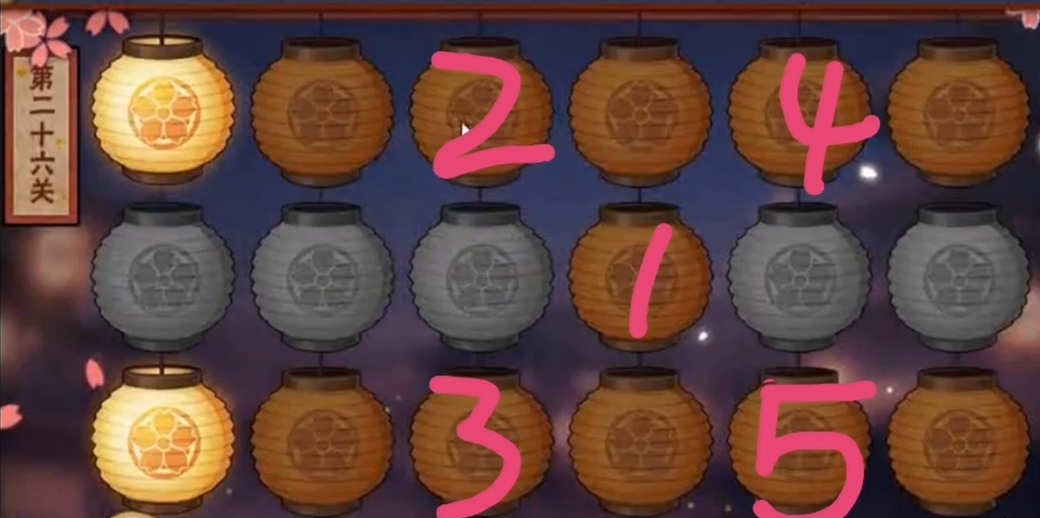 火影忍者疾风传花灯26关的关键解法其实很简单,只要按照特定顺序点击花灯就能轻松过关。首先点击第一行第三个花灯,接着点第三行第三个,然后是第二行第四个,再回到第一行第五个,最后点第三行第五个。这个顺序是经过多次验证的有效解法,每一步都会影响周围花灯的明暗状态,最终让所有花灯都亮起来。记住要严格按照顺序操作,否则可能会打乱之前的步骤哦。